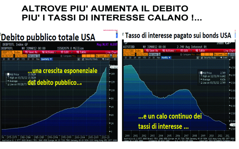 E che si esprimessero sull’isteria da deficit, che tale si è dimostrata negli Stati Uniti, dove all’aumento del debito pubblico corrisponde un tasso di interesse sempre minore, come dimostra la nostra foto. E cercassero di spiegare perché il Giappone, con un debito pubblico del 230% del Pil – ma forse non ha senso dividere il debito formato in decenni per un dato relativo ad un anno? Che senso ha? – paga un sesto dei tassi di interesse della Spagna, che è a meno del 70%, o perché la Germania, che è oltre l’80%, ha avuto le ultime aste sui titoli pubblici a “tassi di interesse negativi”.