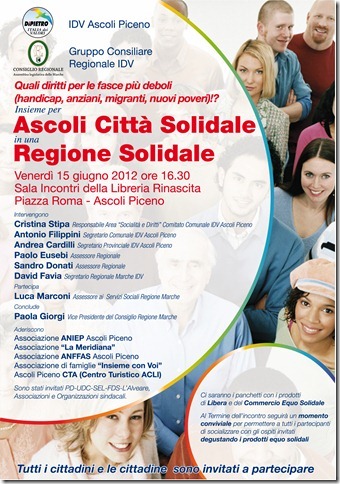 ASCOLI PICENO – La sezione ascolana dell’Italia dei Valori ha organizzato per venerdì prossimo 15 giugno un incontro per dibattere e trovare soluzioni per le categorie più svantaggiate: portatori di handicap, anziani, migranti, nuovi poveri. L’appuntamento è alle 16:30, nella sala dibattiti della libreria Rinascita, in Piazza Roma ad Ascoli.