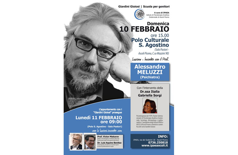 Accanto a lui Italia Gabriella Sorgi, sociologa e psicoterapeuta, direttrice scientifica del corso. Le lezioni-incontro proseguiranno, poi, lunedì 11 a partire dalle ore 9 con gli ospiti internazionali: Victor Makarov, medico e psicoterapeuta, presidente della Lega degli Psicoterapeuti della Russia (PPL) e Luis Alberto Aquino Benitez, psicoterapeuta, docente e conferenziere, presenti ad Ascoli Piceno in occasione del tradizionale gemellaggio scientifico culturale IPAEA-PPL i cui lavori si svolgeranno dal 09 al 14 Febbraio, e che vedrà partecipi delegazioni di professionisti provenienti dalla Russia, dal Kazachistan, dal Belgio e dalla Lettonia.