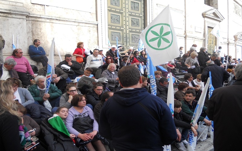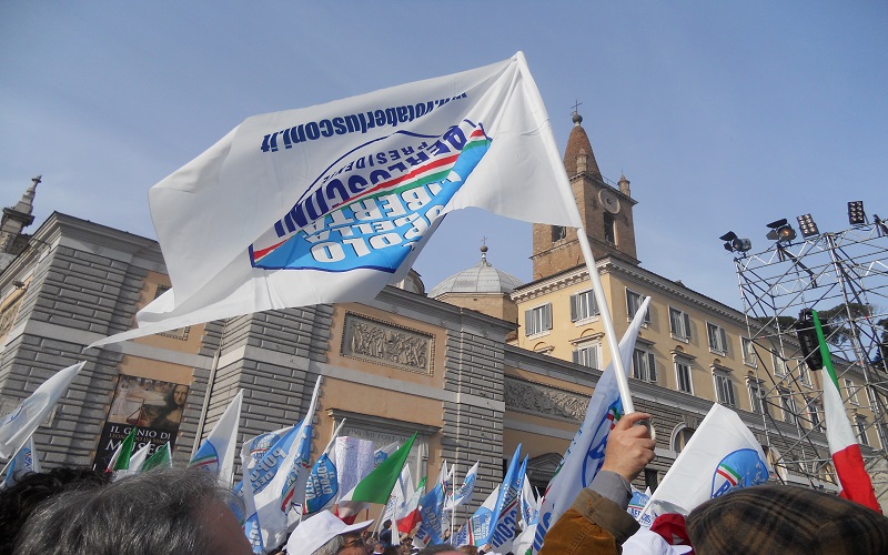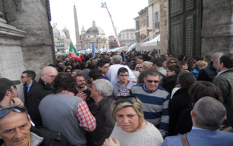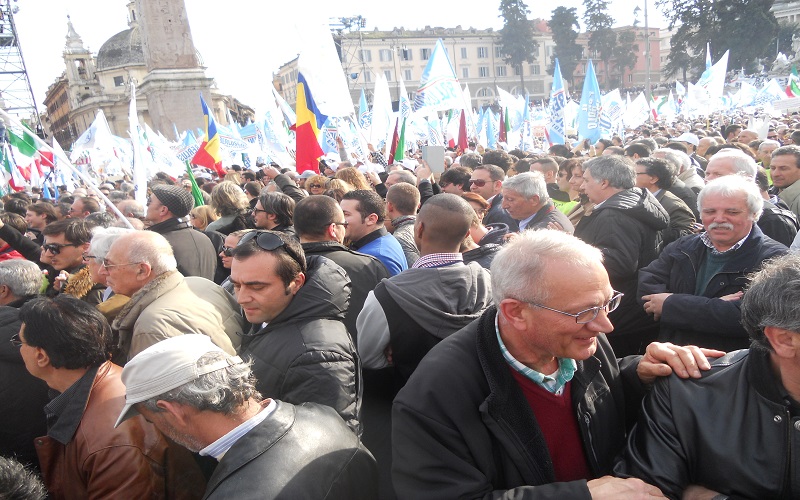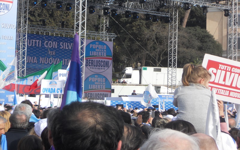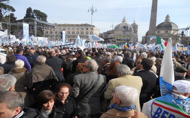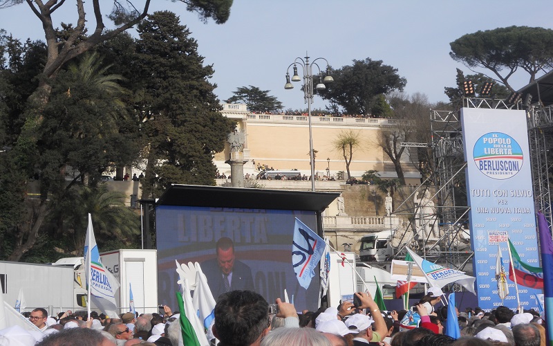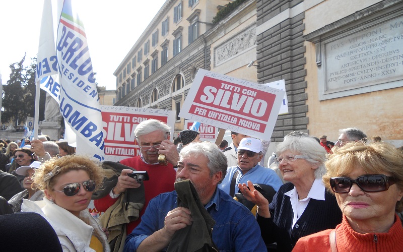ROMA – L’appuntamento è per le 15, ma Berlusconi ancora non c’è sul grande palco allestito in Piazza del Popolo. Al suo posto Mariano Apicella inganna l’attesa con un’irresistibile repertorio neomelodico napoletano. Risultato: la piazza esplode e poco ci manca che inizino i balli di gruppo. L’impressione generale è quella di essere in un villaggio vacanze, anche se guardandoci intorno la situazione non è quella di un benessere diffuso, l’elettorato sembra quello degli irriducibili dalla discesa in campo ed un cartello lo testimonia con la frase “Dal ’94 sempre addosso a Silvio”.