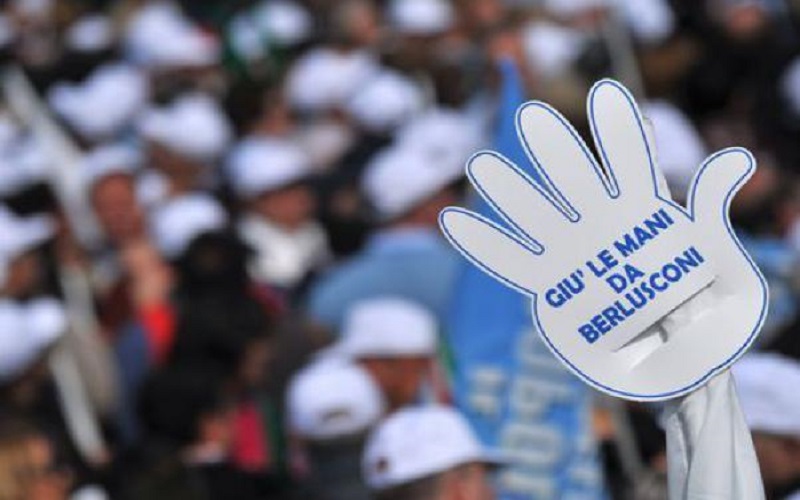 Tutt’intorno le bandiere del Pdl pullulano e svolazzano a destra e a manca, manine di cartone con su scritto “Giù le mani da Silvio”che sventolano a tempo di “Meno male che Silvio c’è”, cartelli contro i pm Boccassini e Woodcock e un filmato con le apparizioni televisive del Cavaliere in campagna elettorale scorre sul maxi schermo. La musica si smorza quando Silvio, finalmente, sale sul palco: “Da qui siete uno spettacolo straordinario!”- esordisce – “Siete già tutti pronti per una nuova campagna elettorale e vincerla per davvero!”- il leader scalda la folla che gli risponde senza indugi.