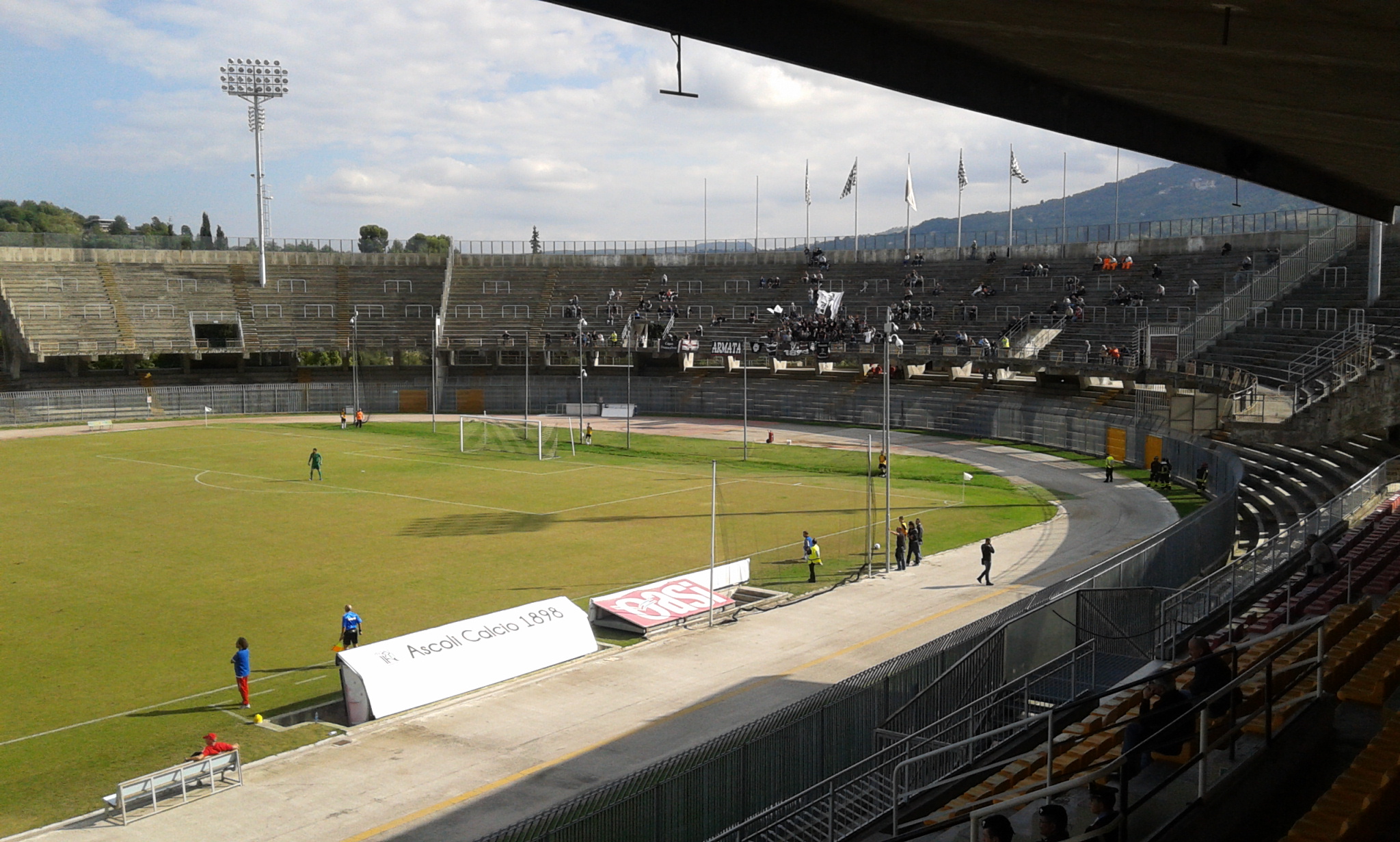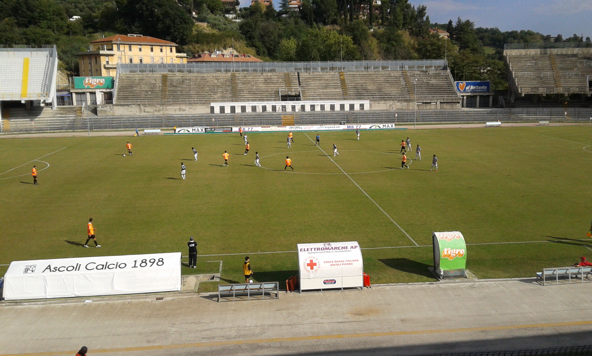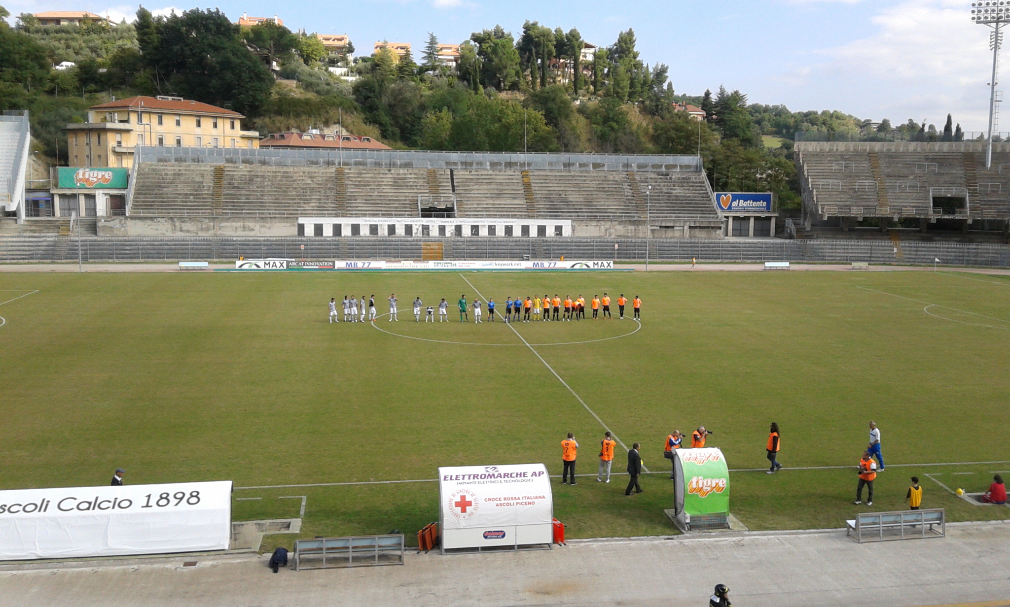 1′ Comincia la partita. L’Ascoli attacca da destra a sinistra. Alcune decine di spettatori in curva sud e tribune.