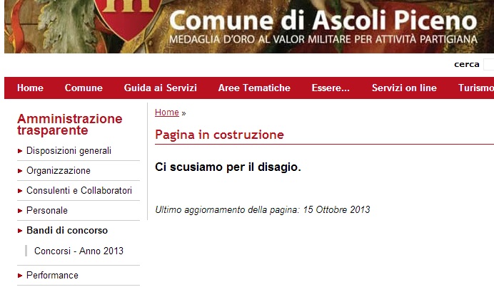 E il “luogo” previsto per legge per questo scopo è il sito internet della Pubblica Amministrazione. E qui Castelli e i suoi rivelano la loro sciatteria: da mesi il sito del Comune è in via di rinnovo e numerose pagine sono del tutto vuote. Basti guardare proprio la sezione “Amministrazione Trasparente”. Ogni link si apre con la stessa dicitura: Ci scusiamo per il disagio” e/o ” I dati relativi a questa sezione sono di prossima pubblicazione”. E i dati a cui si fa riferimento sono quelli riferiti a:Bandi di concorso, Società partecipate, Consulenti e Collaboratori, Sovvenzioni e contributi, Gestione del Patrimonio e tanti altri.