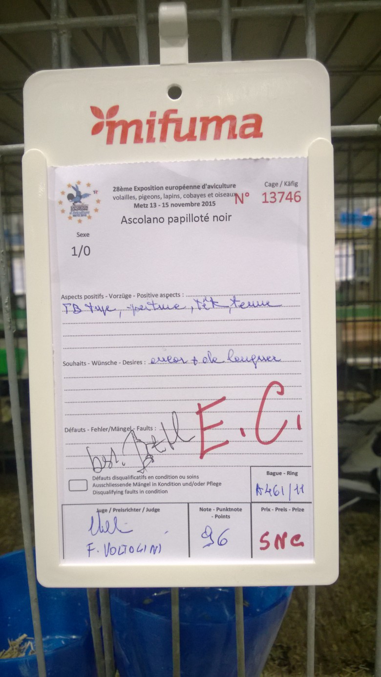 Gli allevatori Acquaroli Gabriele e Mariani Massimo, si sono dati cosi appuntamento nei giorni 13,14,15 Novembre 2015 a Metz in Francia, al Campionato Europeo che si svolge ogni tre anni in una Nazione diversa e il colombo bianconero è stato proclamato Campione Europeo.