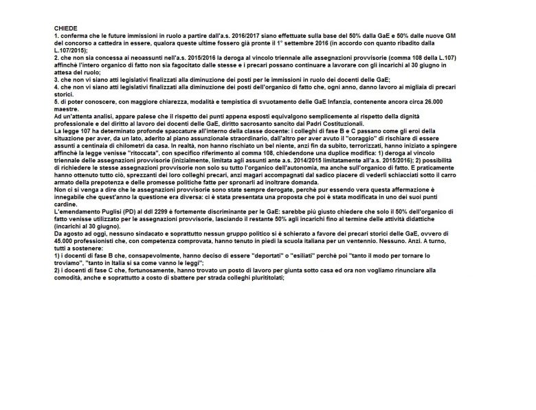 Il comitato attraverso un documento chiede che la legge venga rispettata: “La legge 107 ha determinato profonde spaccature all’interno della classe docente: i colleghi di fase B e C passano come gli eroi della situazione per aver, da un lato, aderito al piano assunzionale straordinario, dall’altro per aver avuto il “coraggio” di rischiare di essere assunti a centinaia di chilometri da casa. In realtà, non hanno rischiato un bel niente, anzi fin da subito, terrorizzati, hanno iniziato a spingere affinché la legge venisse “ritoccata”, con specifico riferimento al comma 108, chiedendone una duplice modifica.