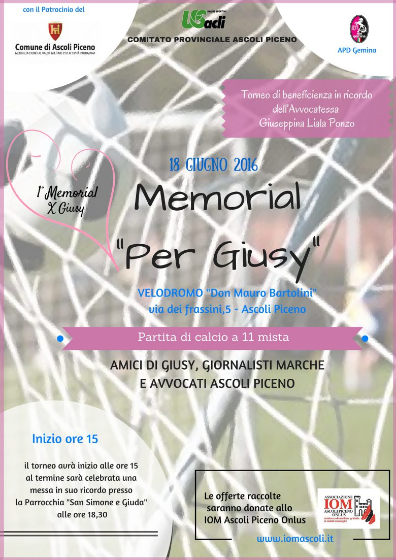 Il memorial “Per Giusy”,si svolgerà presso il Velodromo di Monticelli, il giorno 18 giugno dalle ore 15 alle ore 17 e prevede lo svolgimento di una partita mista di calcio a 11. In concomitanza verranno raccolti fondi di beneficienza per lo IOM Ascoli Piceno Onlus. Al termine una messa in ricordo presso la parrocchia “San Simone e Giuda”.