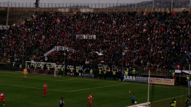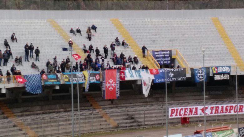 11′ Striscione polemico contro la Iena Nadia Toffa, protagonista recentemente di un servizio video girato ad Ascoli sulla vulnerabilità delle scuole. “Nadia Toffa, a noi le curve, a te il push-up”.