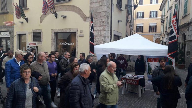 ASCOLI PICENO – Nel pomeriggio di sabato 28 ottobre, i militanti del movimento nazionalista Forza Nuova hanno organizzato in Piazza del Popolo ad Ascoli un gazebo per manifestare il loro dissenso, la loro indignazione e la loro rabbia dopo lo stupro subito da una ragazzina di 13 anni per mano di due richiedenti asilo nigeriani, domiciliati presso l’Oasi Carpineto: due ragazzi di 20 e 21 anni, ora imputati per violenza sessuale su minore.