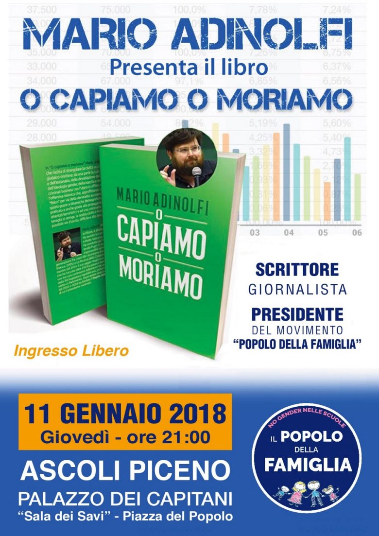 ASCOLI PICENO – Giovedì 11 Gennaio, alle ore 21, ad Ascoli Piceno presso il Palazzo dei Capitani, Sala dei Savi, il circolo “LiberaMente” del movimento “Il Popolo della Famiglia” organizza l’incontro con Mario Adinolfi che con l’occasione presenterà il suo ultimo libro “O capiamo o moriamo“.