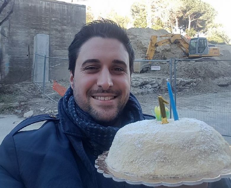 Il consigliere comunale, e capogruppo del Pd di Ascoli, Francesco Ameli, ha “festeggiato” con una torta il primo anniversario dal crollo del muro. Il politico si è recato sul posto e ha immortalato il tutto con una foto.