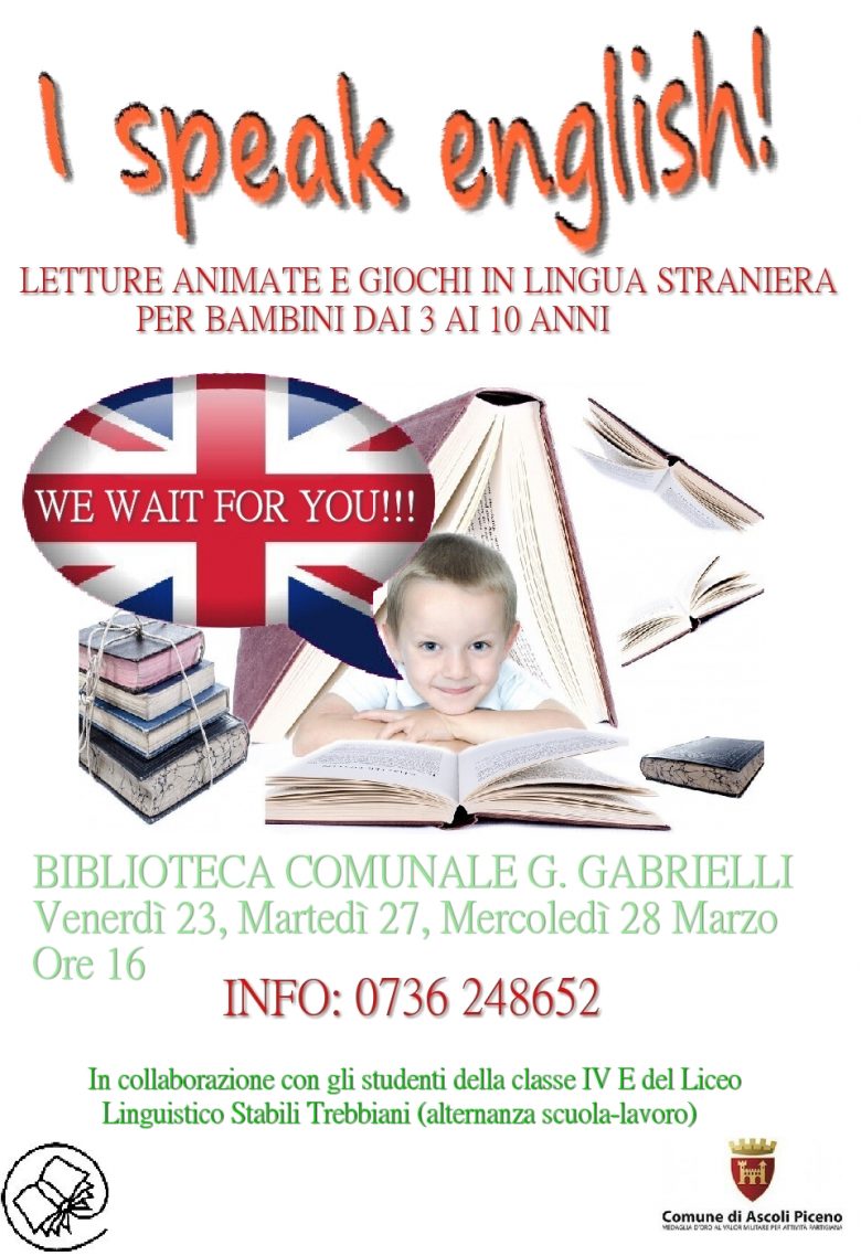 ASCOLI PICENO – Appuntamento venerdì 23 marzo alle ore 16 presso la biblioteca comunale “G. Gabrielli” con “I speak english!”, letture animate e giochi in lingua straniera per bambini dai 3 ai 10 anni.