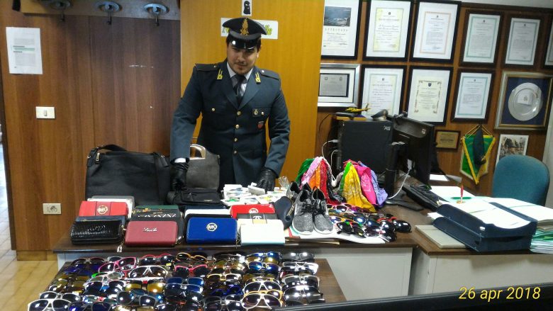 Complessivamente, sono stati sottoposti a sequestro circa 2.500 pezzi, tra articoli di pelletteria, capi di abbigliamento, occhiali da sole e materiali vari.