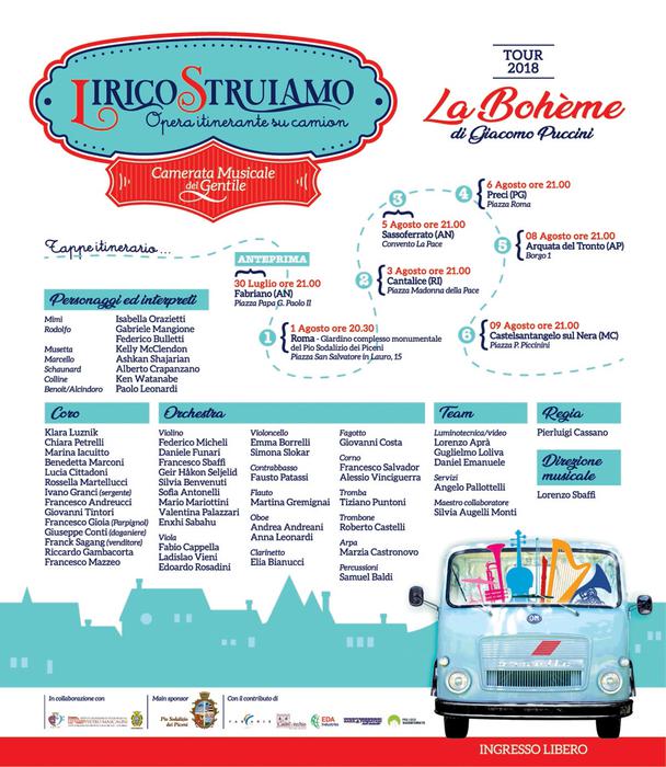La Boheme in un tour su camion nelle zone del cratere sismico per offrire momenti di svago, ma anche sentimenti di speranza e rinascita tramite una delle più alte forme artistiche italiane è organizzata dall’associazione Camerata Musicale del Gentile, in collaborazione con ARTeM Rieti, Istituto Mascagni Livorno, Comune di Fabriano, Main sponsor il Pio Sodalizio dei Piceni.