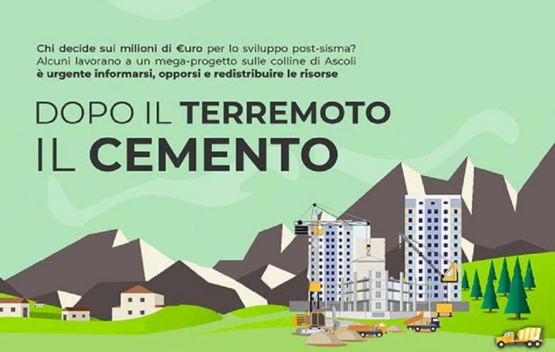 Di seguito la presentazione dell’evento: “Chi decide sui milioni di euro per lo sviluppo post-sisma? Alcuni lavorano a un mega progetto sulle colline di Ascoli: è urgente informarsi, opporsi e redistribuire le risorse. Un’alleanza tra Dipartimenti Universitari, cordate imprenditoriali locali e join-venture pubblico-private regionali, è pronta a intercettare e direzionare i fondi pubblici per il post-sisma. Un vecchio mega progetto, riciclato nel cratere, per edificare ancora, mentre la montagna picena esige piccoli interventi di ricucitura contro il deserto che avanza”.