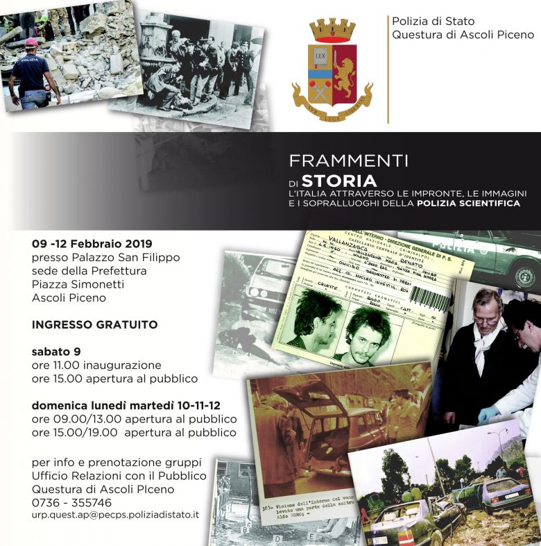 La mostra sarà inaugurata il giorno 9 febbraio alle ore 11 presso Palazzo San Filippo ad Ascoli sede della Prefettura. Il percorso inizierà all’ingresso della Prefettura e si snoderà lungo la scalinata interna fino al 2° piano piano di rappresentanza della Prefettura ove in una delle stanze verrà ricostruita una scena del crimine a cura della Polizia Scientifica.