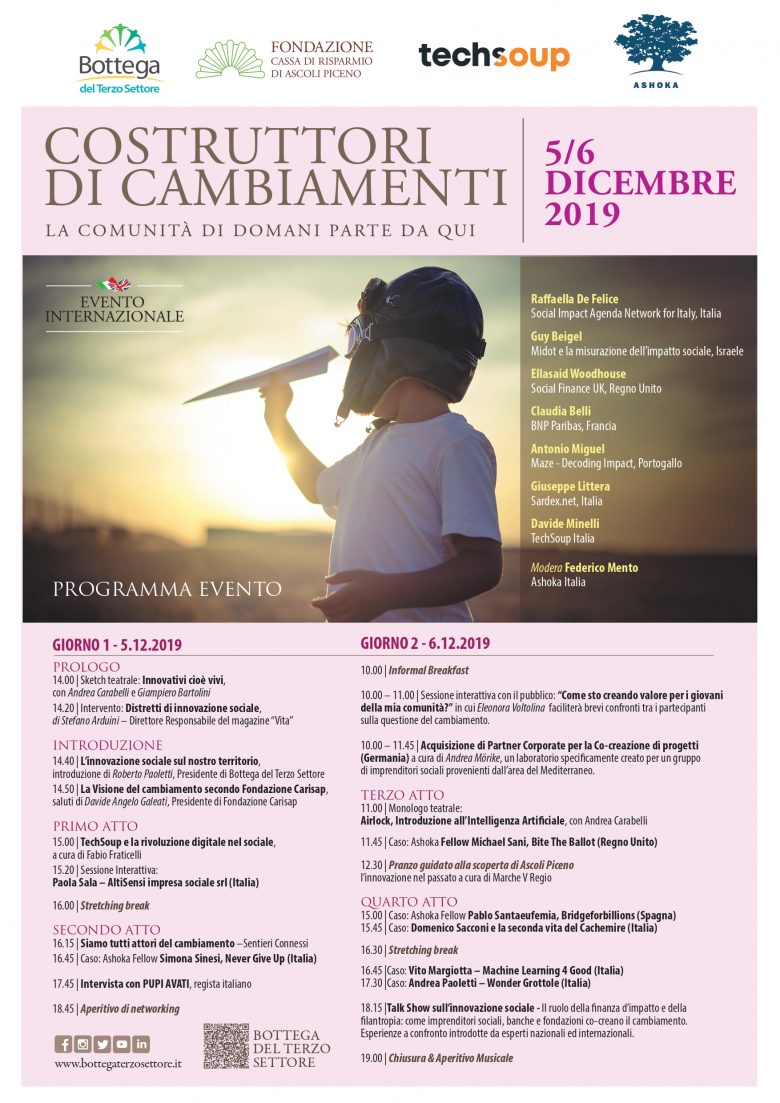 ASCOLI PICENO – Si è svola oggi 2 dicembre, presso gli spazi della Bottega del Terzo Settore, la presentazione dell’evento internazionale “Costruttori di cambiamenti. La Comunità di domani parte da qui“. L’evento, in programma il 5 e 6 dicembre presso Bottega del Terzo settore, si colloca all’interno di una precisa strategia di rilancio del territorio che la Fondazione Cassa di Risparmio di Ascoli Piceno, anche grazie alla fondamentale collaborazione di Bottega, sta mettendo in campo per lo sviluppo del territorio, potendo contare su una sempre più ampia rete di player di rilevanza mondiale. In questo evento determinanti sono state le collaborazioni con Ashoka Italia, la più grande rete di imprenditori sociali del mondo, e TechSoup, la prima piattaforma internazionale che aiuta le organizzazioni No Profit di tutto il mondo ad intraprendere un percorso di trasformazione digitale.