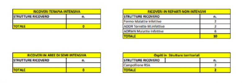 ORE 13.30 AGGIORNAMENTO GORES MARCHE Scendono i ricoveri nelle Marche: ora sono 10. Zero in Terapia Intensiva e Semi.