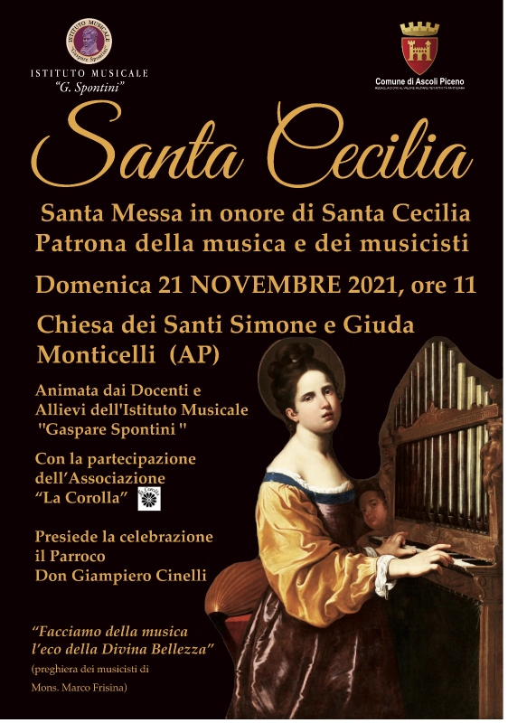 ASCOLI PICENO – Come è tradizione dell’Istituto Musicale “Gaspare Spontini” domenica 21 novembre alle ore 11 presso la Chiesa di Santi Simone e Giuda a Monticelli, sarà celebrata la Messa in onore di Santa Cecilia, patrona della Musica e dei Musicisti.