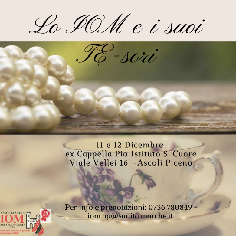 ASCOLI PICENO – Grazie alla generosità della famiglia Cottilli, che in seguito alla chiusura della storica gioielleria ha donato alla IOM numerosi gioielli, sabato 11 ( dalle 10 alle 12 e dalle 16 alle 20) e domenica 12 dicembre ( dalle 16 alle 20), l’Associazione ha organizzato due giornate speciali di raccolta fondi in occasione delle festività natalizie.