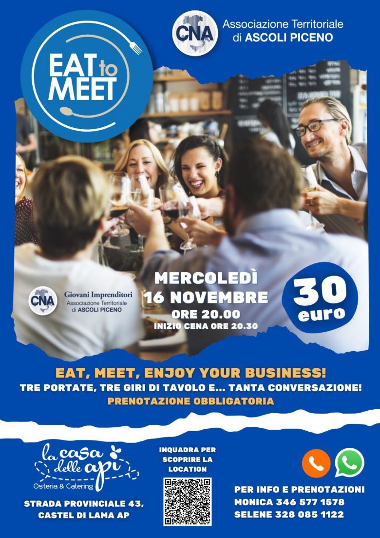Stringere nuovi rapporti con potenziali partner commerciali, dando vita a sinergie potenzialmente vincenti comodamente seduti a tavola: quello di “Eat to Meet” è un format ormai collaudato, che per l’occasione l’associazione territoriale di Ascoli ha scelto di riproporre negli spazi de “La casa delle api” di Castel di Lama, cornice ideale per condividere idee, progetti, riflessioni ed eventuali dubbi di persona, senza il bisogno di ricorrere – almeno per una sera – alle opportunità offerte dal digitale e dallo smart working.