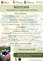 ASCOLI PICENO – Nella mattina di sabato 18 novembre 2023, alle ore 10, avrà luogo presso l’Auditorium Cellini, sito nel Polo Sant’Agostino, il Convegno dal titolo “Musicoterapia: presentazione ed applicazioni nel Piceno”.