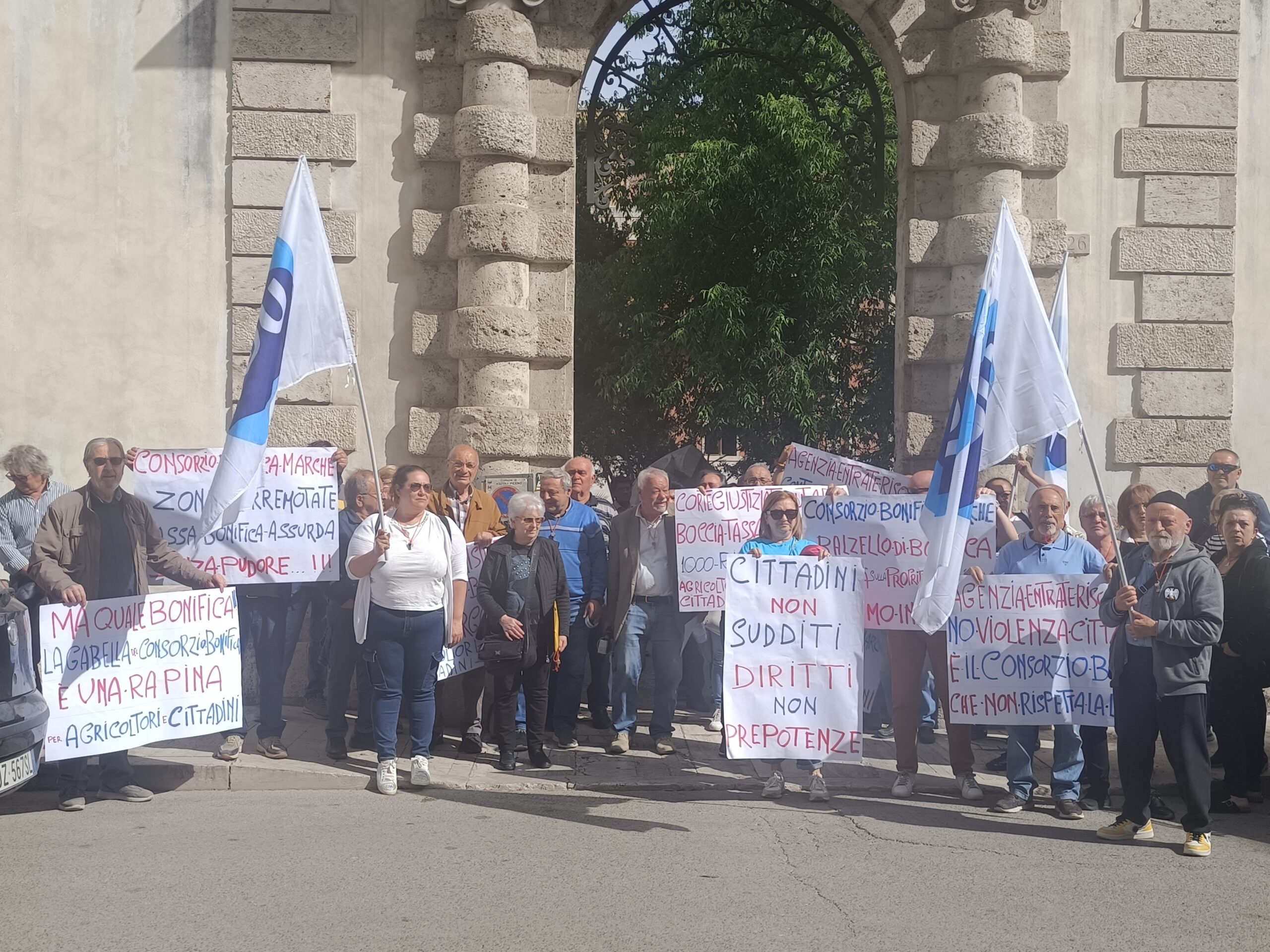 Una rappresentanza di circa 25 agricoltori e il sindacalista Pino Marucci, con cartelli e megafono, in base a quanto dichiarato da alcuni dei manifestanti “Proteste contro la tassa di bonifica, che portiamo avanti da anni in tutta la regione, per le mancanze di manutenzione da parte del Consorzio, come nel caso dei fiumi, sono anni che manifestiam”. Nei cartelli si legge:”Cittadini non sudditi, diritti e non prepotenze”