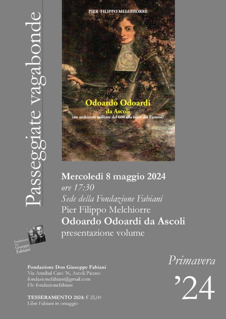 ASCOLI PICENO – Mercoledì 8 maggio alle ore 17,30 quarto appuntamento del programma “Passeggiate Vagabonde” della Fondazione Don Giuseppe Fabiani, presso la sede in via Annibal Caro 36; l’architetto Pier Filippo Melchiorre presenterà il volume Odoardo Odoardi da Ascoli (un architetto militare del 600 alla corte dei Farnese) edito nella collana Quaderni del Consiglio regionale delle Marche. Il volume è la traduzione commentata del manuale “La Moderna Architettura Militare agevolata con un breve metodo” scritto nel 1681 dall’Odoardi e dedicato al Duca di Parma, Ranuccio Farnese.