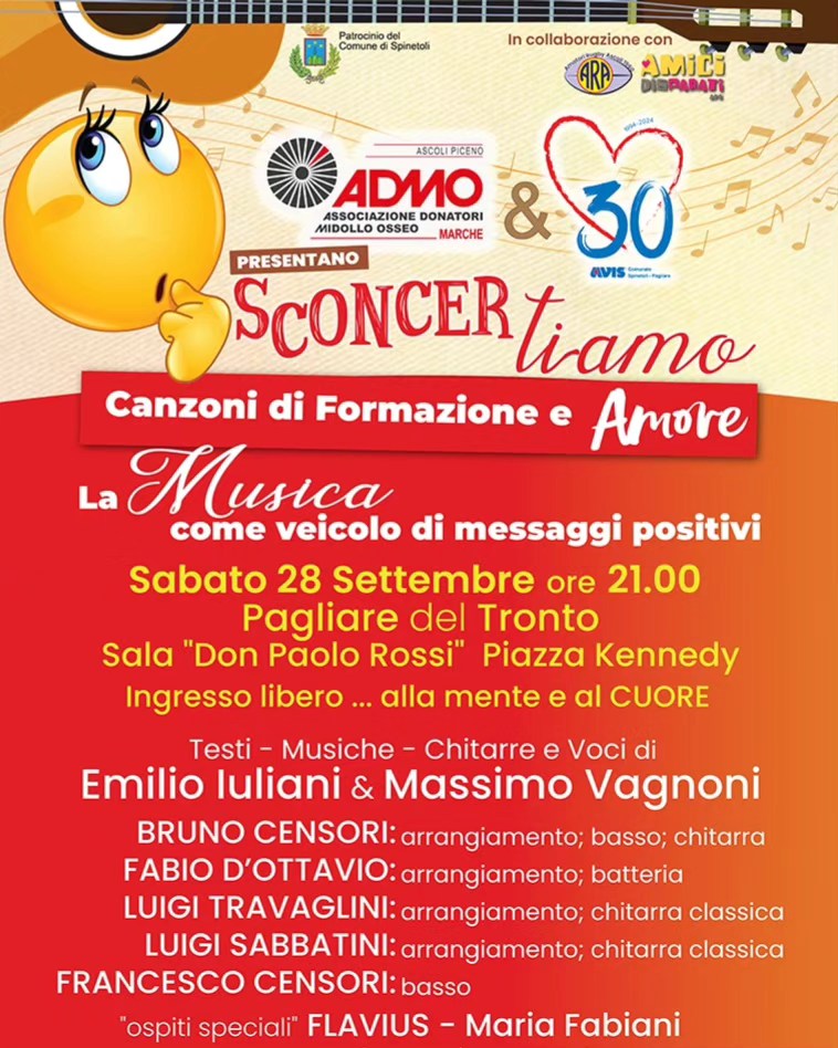 Sabato sera, 28 settembre, Avis Spinetoli-Pagliare e Admo Marche presentano SCONCERtiamo, un concerto di canzoni inedite che vanno dal pop al funky, scritte e musicate da Emilio Iuliani e Massimo Vagnoni.