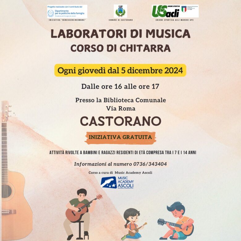 CASTORANO – Dal 5 dicembre prenderà il via un corso di chitarra che si svolgerà ogni giovedì dalle 16 alle 17 presso la Biblioteca comunale di via Roma.