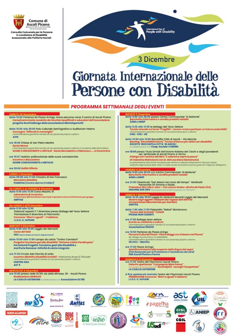Questa mattina, 29 novembre, si è svolta, alla sala De Carolis e Ferri di Palazzo Arengo ad Ascoli, la conferenza stampa di presentazione del programma delle iniziative organizzate dall’Amministrazione comunale, in collaborazione con le associazioni del territorio, in occasione della Settimana europea dei diritti delle persone con disabilità.