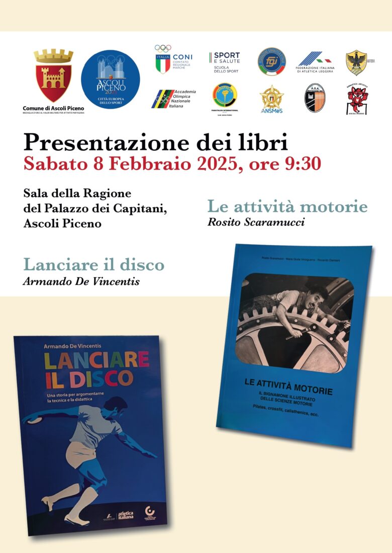 ASCOLI PICENO – Tra i tanti eventi previsti nell’ambito di “Ascoli Città Europea dello Sport 2025”, sabato 8 febbraio alle ore 9.30 alla sala della Ragione di Palazzo dei Capitani, ci sarà la presentazione di due libri scritti da altrettanti ascolani, il professor Rosito Scaramucci e il Maestro di sport Armando De Vincentis.