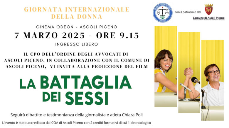 ASCOLI PICENO – Venerdì 7 marzo al Cinema Odeon dalle 0re 9.15, il Cpo dell’Ordine degli Avvocati di Ascoli Piceno, in collaborazione con il Comune di Ascoli Piceno, invita alla proiezione del film “La battaglia dei sessi”. Seguirà dibattito e testimonianza della nostra giornalista e calciatrice Chiara Poli.