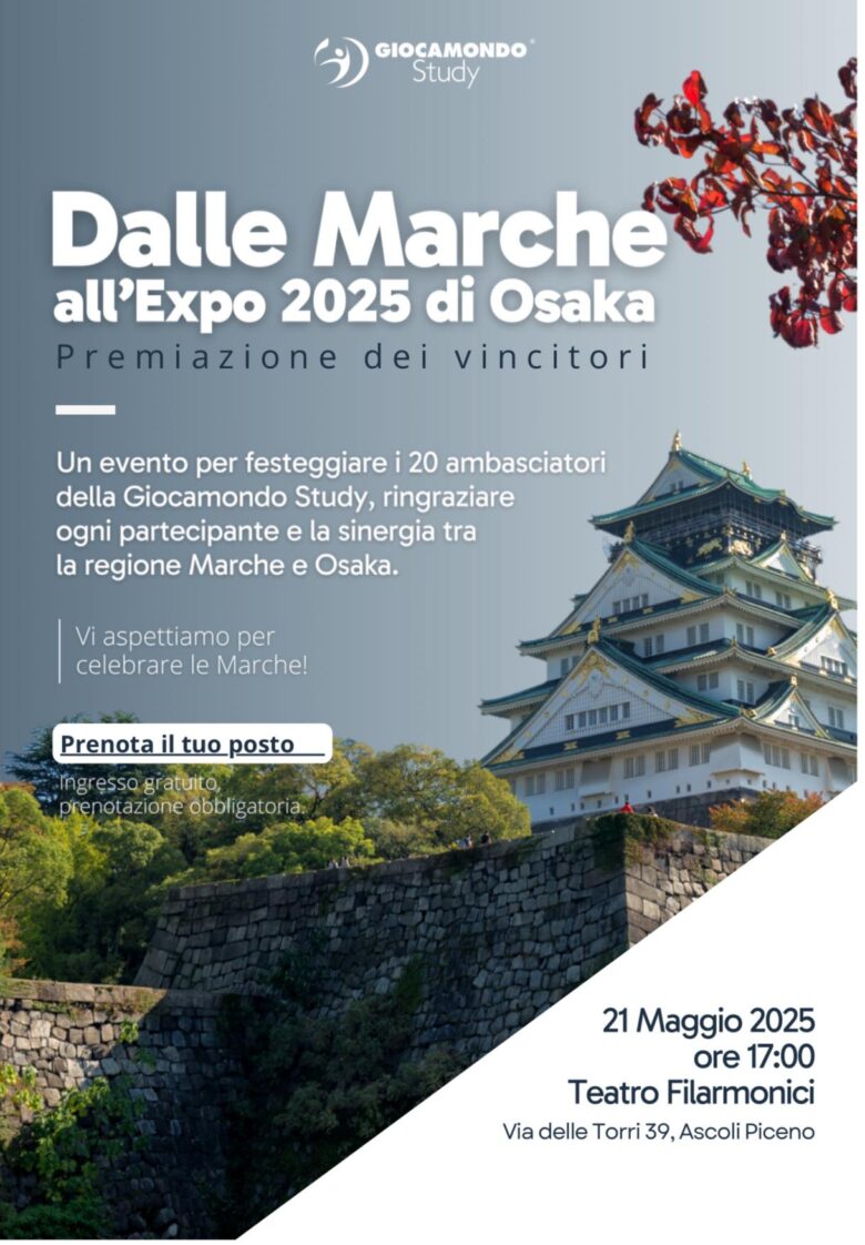 ASCOLI PICENO – Arriva il momento più importante: mercoledì prossimo, 21 maggio, alle ore 17, al teatro Filarmonici di Ascoli Piceno, verranno ufficialmente annunciati i nomi dei 20 studenti che saranno, con il sostegno della Regione, “ambasciatori” ufficiali di Giocamondo Study all’Expo 2025 di Osaka, in Giappone, e che contribuiranno a promuovere le bellezze del territorio marchigiano a livello internazionale.