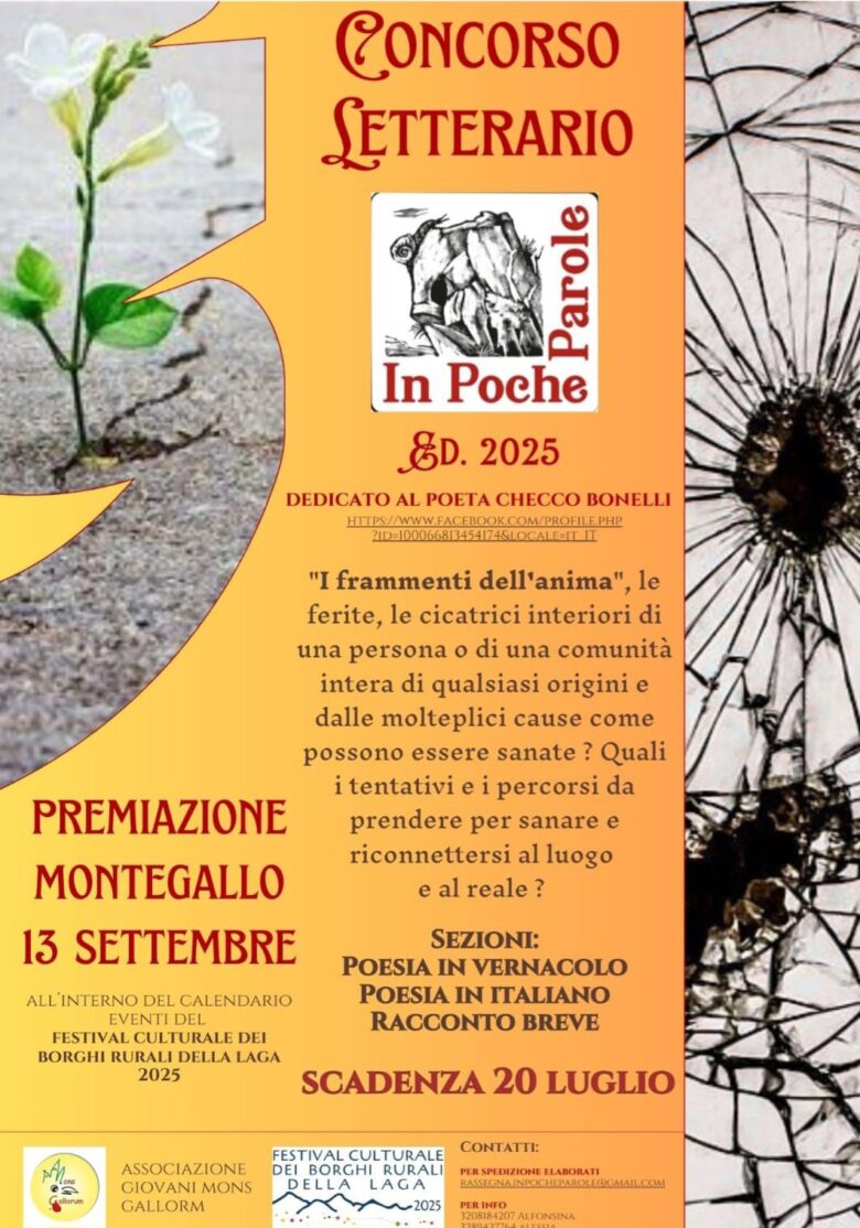 Tutte le informazioni e il bando completo sono disponibili sulla pagina Facebook dell’Associazione Mons Gallorum, sulla pagina dedicata “In Poche Parole” e contattando i numeri 320.8184207, 328.9427764, 389.1736250.