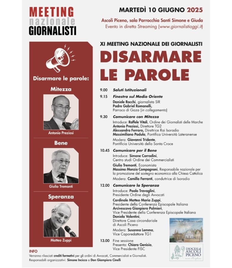 ASCOLI PICENO – Un Meeting molto atteso e partecipato si appresta a fare tappa nel Piceno. Martedì 10 giugno, nella sala della parrocchia Santi Simone e Giuda a Monticelli di Ascoli, si terrà la XI edizione del Meeting nazionale dei Giornalisti, dal titolo “Disarmare le parole”, organizzato in sintonia con le Diocesi del Piceno, l’Ordine dei Giornalisti delle Marche, l’Ordine degli Avvocati e dei Commercialisti. Responsabili organizzativi dell’evento sono i giornalisti Simone Incicco e don Gianpiero Cinelli.