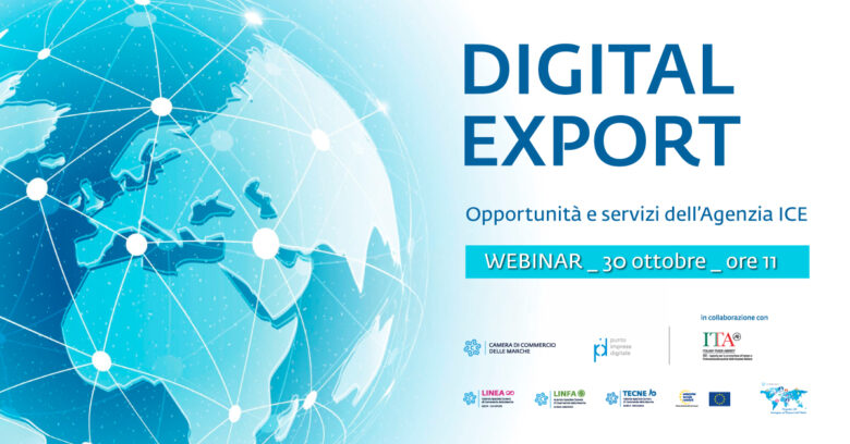 Webinar dedicato al tema dell’export e internazionalizzazione, dal titolo “Digital Export”, si terrà il 30 ottobre. Il Punto Impresa Digitale della Camera di Commercio delle Marche organizza l’evento in collaborazione con l’Agenzia ICE e con le Aziende Speciali per l’Export della Camera Marche.Per programma e iscrizioni: https://www.eventbrite.it/e/webinar-digital-export-tickets-1794733118069?aff=oddtdtcreator