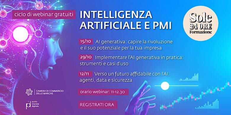 Camera di Commercio delle Marche e Sole 24 ORE Formazione organizzano nell’ambito delle attività del Punto Impresa Digitale della Camera, un ciclo di 3 webinar dedicati all’Intelligenza Artificiale per presentare le straordinarie opportunità e applicazioni concrete dell’AI nei contesti e processi operativi delle PMI, da destinare alle realtà produttive e professionali del territorio. Il programma prevede 3 webinar di 90 minuti che tratteranno, con un taglio estremamente pratico