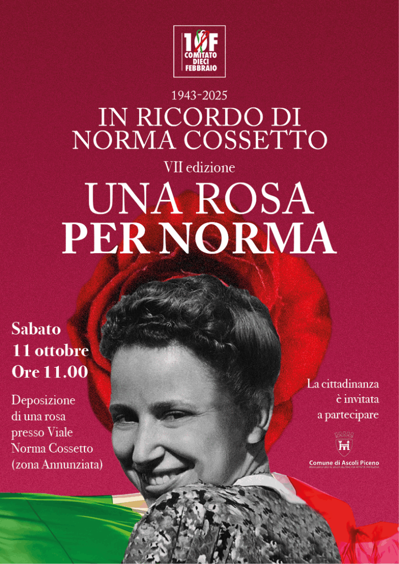 ASCOLI PICENO – Sabato 11 ottobre 2025 alle ore 11, ad Ascoli Piceno, nell’omonima via a lei intitolata in zona Annunziata, sarà ricordata Norma Cossetto, la giovane studentessa istriana che, nell’ottobre 1943, venne sequestrata, seviziata, violentata e gettata nella foiba di Villa Surani dai partigiani di Tito ed alla quale il Presidente della Repubblica Ciampi, nel 2005, concesse la Medaglia d’Oro al Merito Civile. “Una rosa per Norma Cossetto” è una manifestazione promossa in tutta Italia dal “Comitato 10 Febbraio” , giunta alla 7^ edizione, e che ogni anno interessa un numero sempre crescente di città italiane ed anche estere. Ad Ascoli Piceno ha ricevuto il patrocinio dell’Amministrazione Comunale. All’iniziativa è invitata tutta la cittadinanza, parteciperanno le autorità civili, religiose e militari. La memoria di Norma Cossetto consente di ricordare tutte le altre vittime dello stesso contesto storico e tutte le donne che, ancora oggi, in guerra e in pace, subiscono violenze. Come da programma, sarà deposta una rosa nel ricordo di Norma Cossetto.