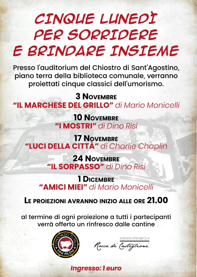 “Cinque lunedì per sorridere e brindare insieme” con proiezioni di film classici sull’umorismo presso l’auditorium del Chiostro di Sant’Agostino, piano terra della biblioteca comunale di Ascoli. Ieri sera, lunedì 3 novembre ,c’era “Il Marchese del Grillo” di Mario Monicelli.