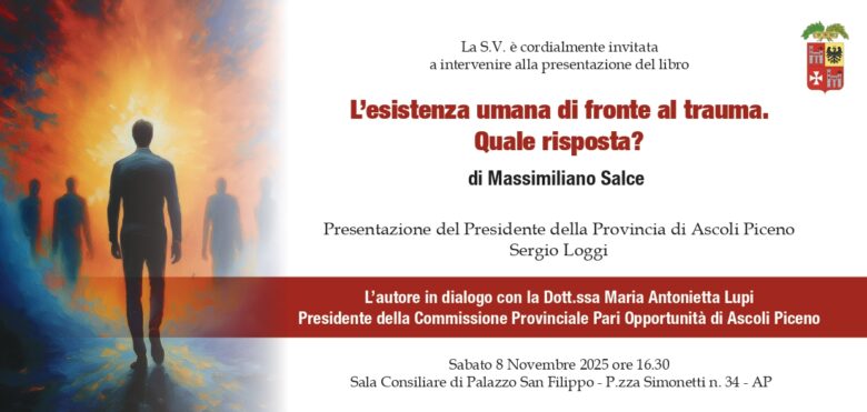 ASCOLI PICENO – Sabato 8 novembre, nella sala consiliare di Palazzo San Filippo, con il patrocinio dell’Ente, si svolgerà alle 16.30 la presentazione del libro “L’esistenza umana di fronte al trauma. Quale risposta?” di Massimiliano Salce, edito dalla Edizioni Magi.