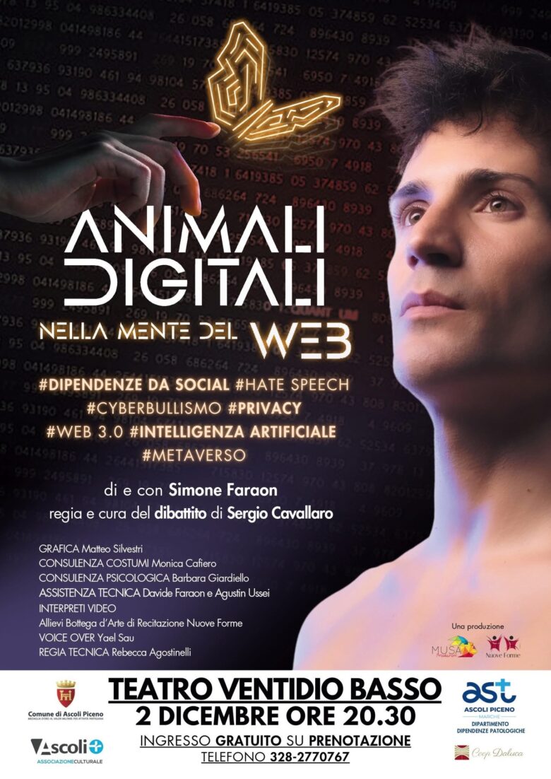 ASCOLI PICENO – Sensibilizzare la popolazione, soprattutto quella più giovane, sul cyberbullismo, sulla dipendenza dai social, l’intelligenza artificiale e, più in generale, sulla sicurezza quando si naviga sul web. Questo il fine dello spettacolo dal titolo ‘Animali digitali – nella mente del web’ – in programma domani martedì 2 e mercoledì 3 dicembre al teatro Ventidio Basso di Ascoli, giovedì 4 dicembre al teatro delle Energie di Grottammare – promosso dall’Ast di Ascoli, attraverso il Dipartimento dipendenze patologiche diretto da Marco Giri, per accendere i riflettori su questo importante tema di salute mentale.