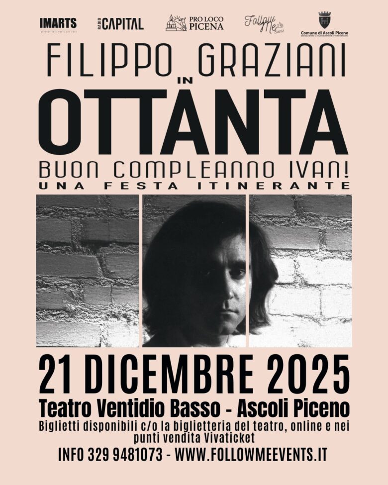 ASCOLI PICENO – Il Teatro Ventidio Basso si prepara ad ospitare un evento di grande intensità emotiva e musicale: “Filippo Graziani – OTTANTA. Buon compleanno Ivan!”. Uno spettacolo che non è una semplice esecuzione, ma un vero e proprio viaggio nell’anima e nella musica di Ivan Graziani, in occasione di quello che sarebbe stato il suo ottantesimo compleanno.