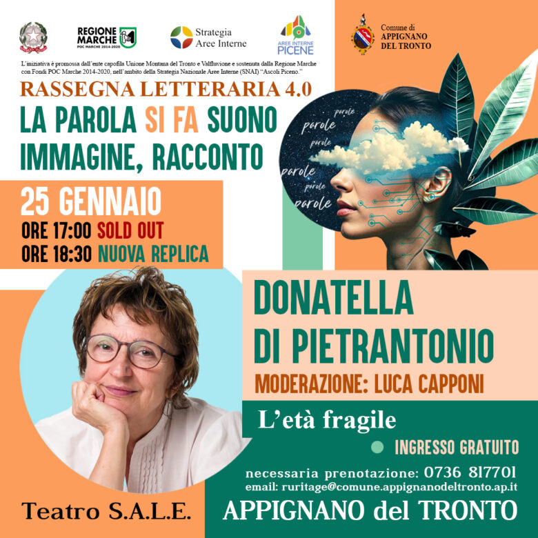 APPIGNANO DEL TRONTO – Domenica 25 gennaio, presso il Teatro S.A.L.E. di Appignano del Tronto, si terrà l’ultimo appuntamento della Rassegna Letteraria 4.0. Protagonista dell’incontro sarà Donatella Di Pietrantonio, una delle voci più intense e autorevoli della narrativa italiana contemporanea, che presenterà il suo ultimo romanzo L’età fragile, vincitore del Premio Strega 2024.