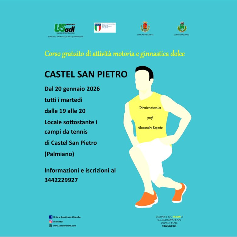 PALMIANO – Ogni martedì dalle 19 alle 20 si svolge un corso gratuito di attività motoria e ginnastica dolce nel locale sottostante i campi da tennis di Castel San Pietro di Palmiano.