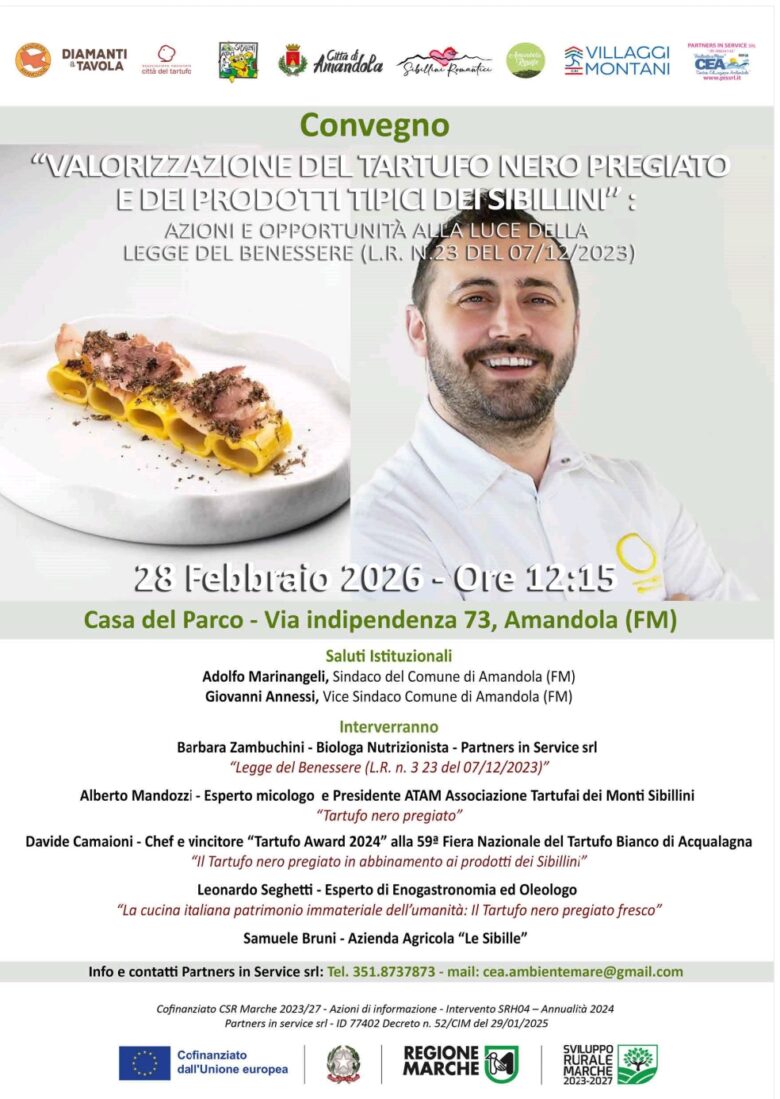 Amandola (FM) – Sabato 28 febbraio 2026 e Domenica 1 Marzo 2026 al via la 7^ edizione “Diamanti a Tavola – Festival del Tartufo Nero Pregiato di Amandola e dei prodotti tipici dei Sibillini” Appuntamento con tre convegni ed una sessione pratica di approfondimento dedicata al tartufo nero pregiato, con appuntamenti tecnici e divulgativi rivolti a operatori del settore, appassionati e cittadini. L’iniziativa rientra nelle azioni di informazione del CSR Marche 2023/27 – Intervento SRH04 – Annualità 2024 organizzati da Partners in Service srl, titolare del CEA Ambiente e Mare, R. Marche, riconosciuto Organismo di Consulenza aziendale per le Imprese Agricole e Forestali – Sviluppo Aree Rurali e Qualità delle Produzioni R. Marche MASAF /ISMEA in collaborazione con il Comune di Amandola, ATAM Associazione Tartufai dei Monti Sibillini.